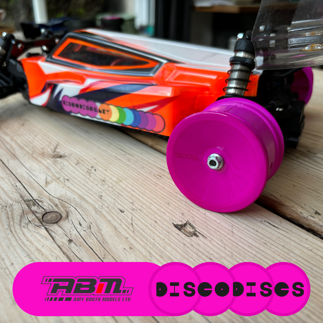 Amy Booth Models (ABM) gloss finish, genuine wheels hand dyed to the colour of your choice. Our best value wheels are NEW and super quality with vivid colour. They have the same offset and fit all modern buggies: Schumacher, Xray, AE, Yokomo, Mugen…